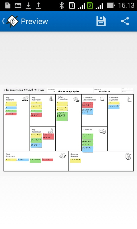 Untuk menyimpan ke PDF atau image adalah dengan mengklik tanda save. Ada dua pilihan yaitu PDF dan image, silahkan pilih sesuai keinginan. Dan hasil akhir dari Business Model Kanvas pun sudah tersimpan.