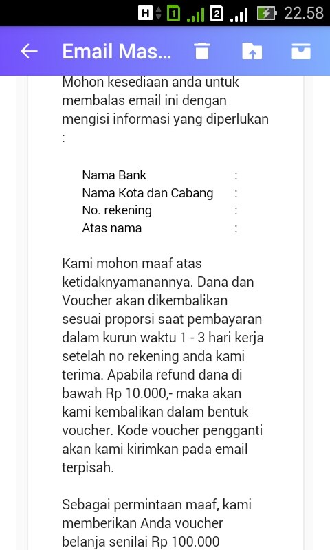 Setelah diisi, beberapa waktu kemudian muncullah pemberitahuan bahwa uang sudah direfund ke rekening saya.