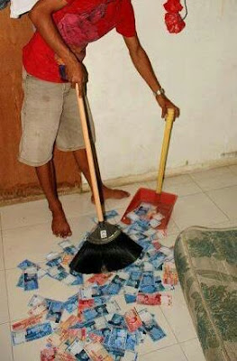 Begitulah para pengusaha, memaknai nilai uang. Mereka menghargai nilai uang seberapapun itu. Maka anda yang hidupnya biasa-biasa saja, tidak usahlah sok gaya-gayaan dengan berlaga menyapu uang. Hanya pamer biar beken di dunia maya, padahal dialam nyatanya meringis karena kebanyakan gaya