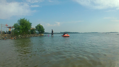 Oh iya, karena banyak anak-anak yang antusias. Akhirnya saya mengajak beberapa anak lokal untuk bermain bersama. Saya memberikan mereka kesempatan menaiki perahu karet untuk pertama kalinya dalam hidup mereka. Mereka tampak senang, merasakan serunya permainan baru.