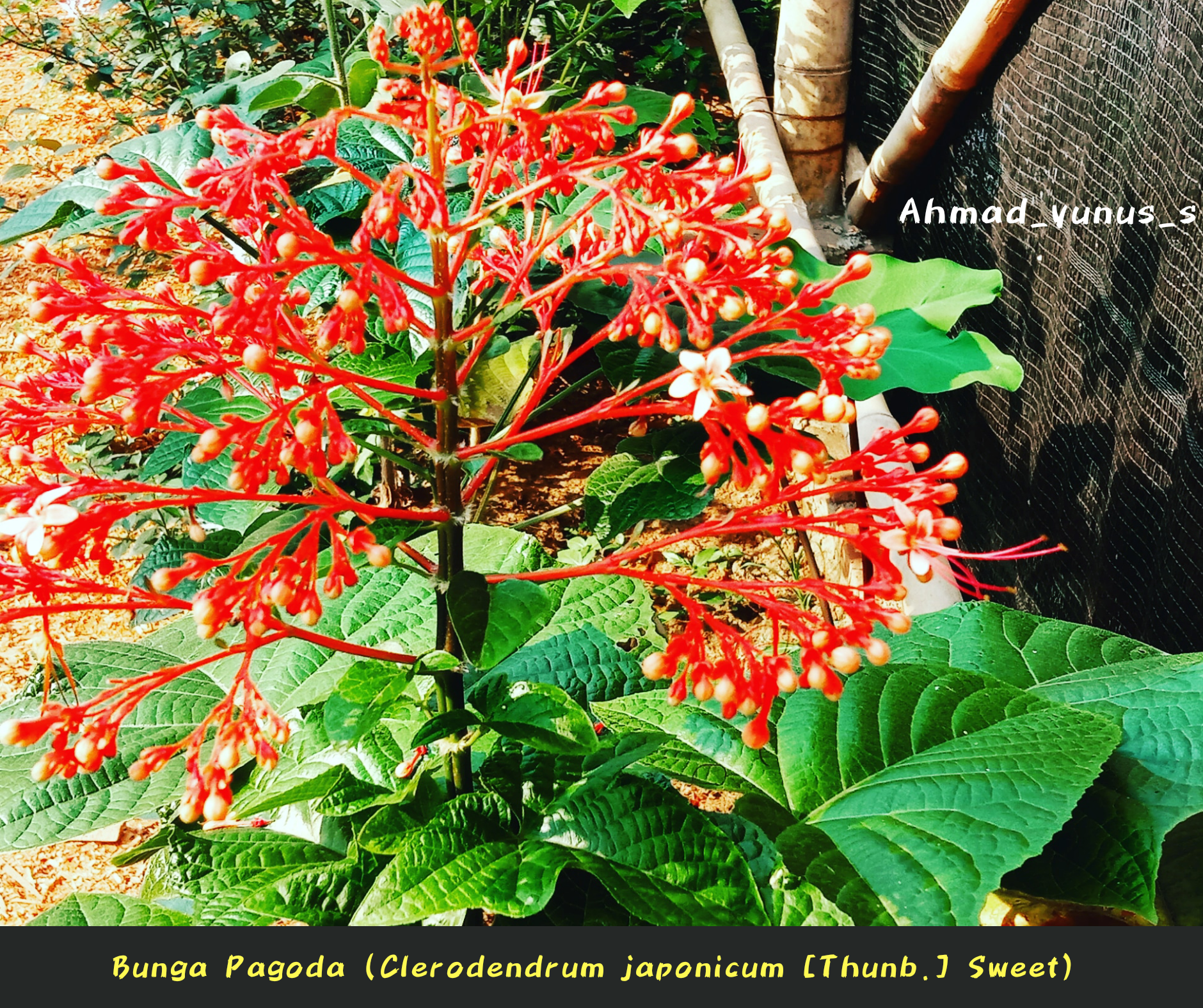 Umumnya, ditanam di taman, pekarangan rumah, atau di tepi jalan daerah luar kota sebagai tanaman hias. Perdu meranggas, tinggi 1-3 m. Batangnya dipenuhi rambut halus. Daun tunggal, bertangkai, letak berhadapan. Helaian daun berbentuk bulat telur melebar, pangkal daun berbentuk jantung, daun tua bercangap menjari, panjangnya dapat mencapai 30 cm. Bunganya bunga majemuk berwarna merah, terdiri dari bunga kecil-kecil yang berkumpul membentuk piramid, keluar dari ujung tangkai. Buahnya bulat. Bunga pagoda dapat diperbanyak dengan biji.