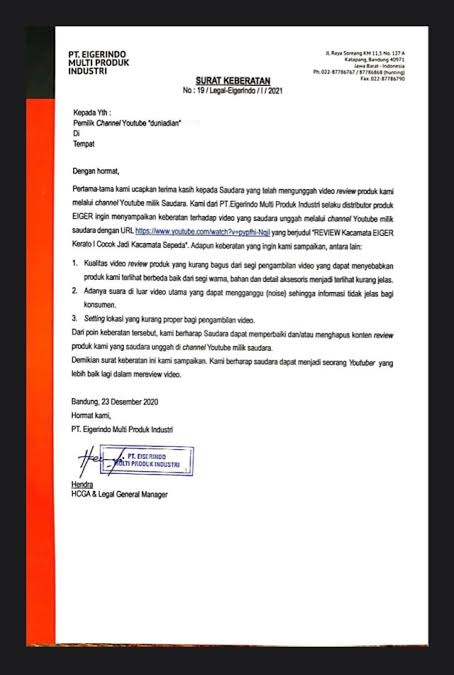 Nama merek Eiger seketika menjadi trending topic di Twitter gara-gara sepucuk surat. Surat tersebut, Eiger tujukan kepada seorang YouTuber bernama Dian Widiyanarko atau @duniadian. Produsen alat-alat outdoor activities itu merasa keberatan dengan konten review produk di akun Dian.