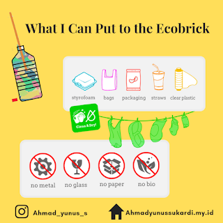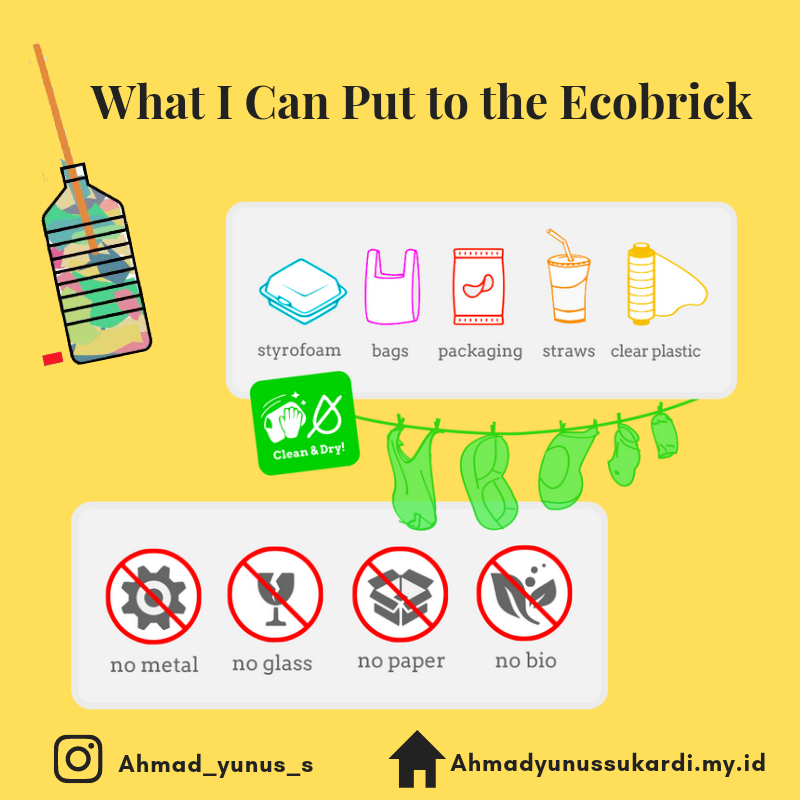 Tidak semua jenis sampah dapat dimasukan ke botol dan menjadi ecobrik. Ada beberapa jenis sampah yang malah tidak boleh dijadikan ecobrick. Untuk jenis sampah yang bisa digunakan dan tidak bisa digunakan lihat gambar di bawah.